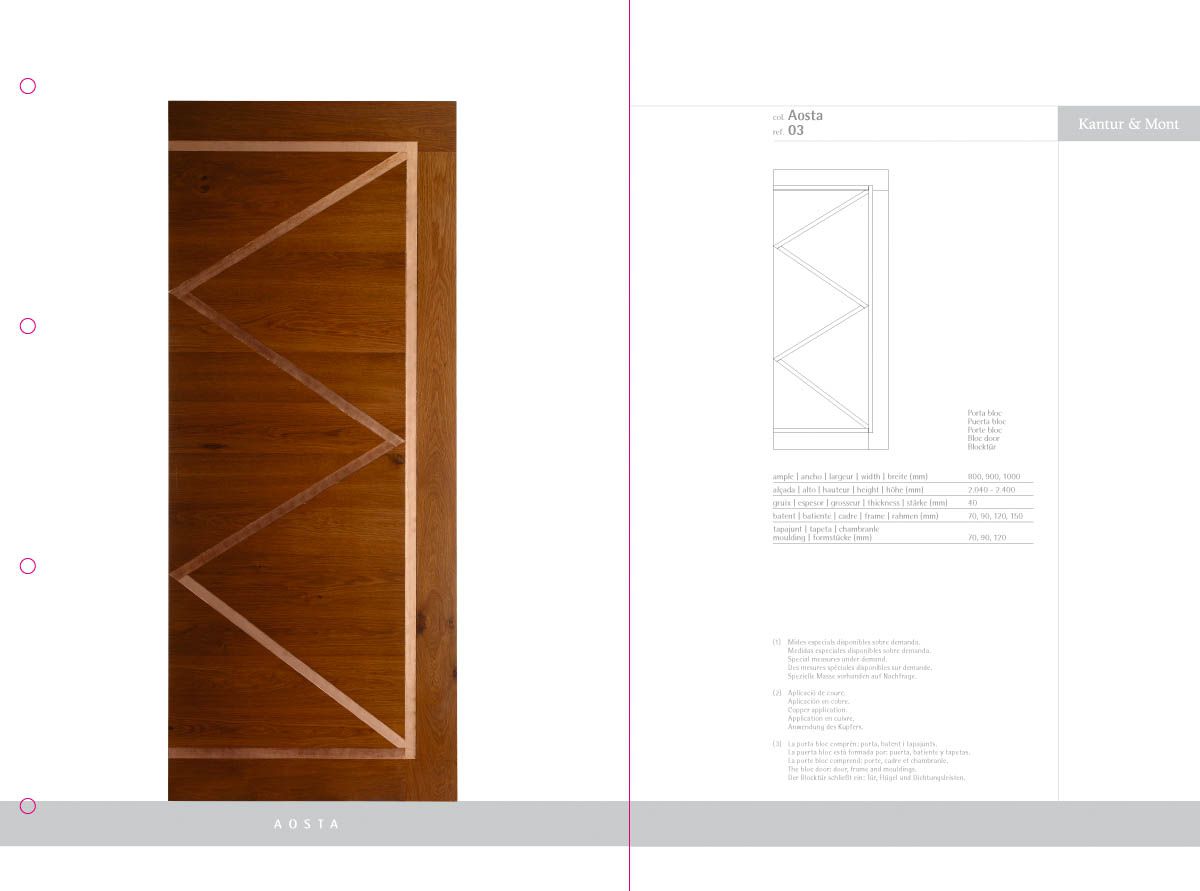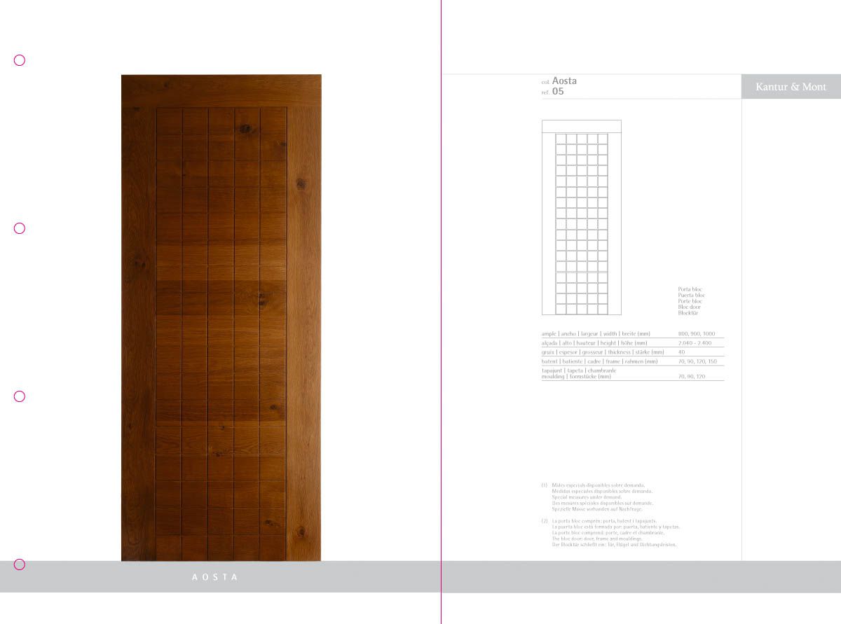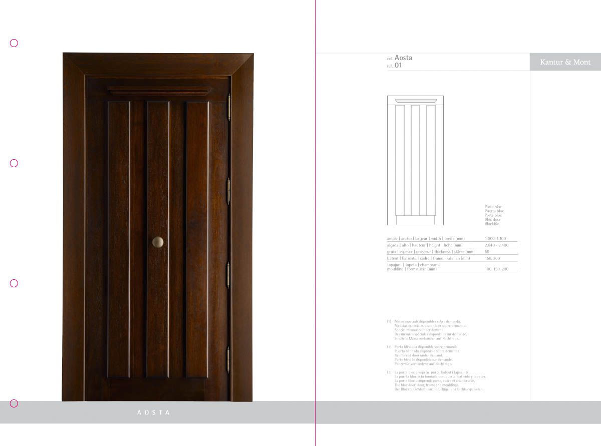 Desenvolupament d’un catàleg de producte com a eina comercial i mostrari de producte, a partir de la idea creativa original i la seva implementació en format de fitxes incloses en una carpeta d'anelles per a properes incorporacions de noves referències. El treball inclou la fotografia de les portes i detalls de producte.
