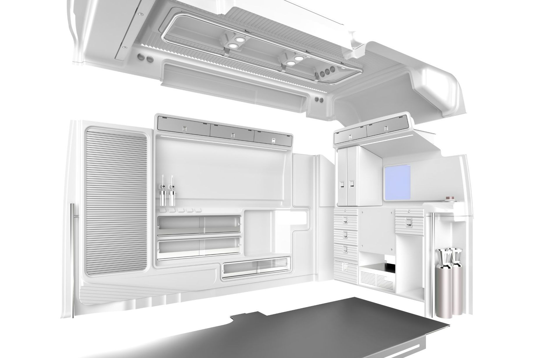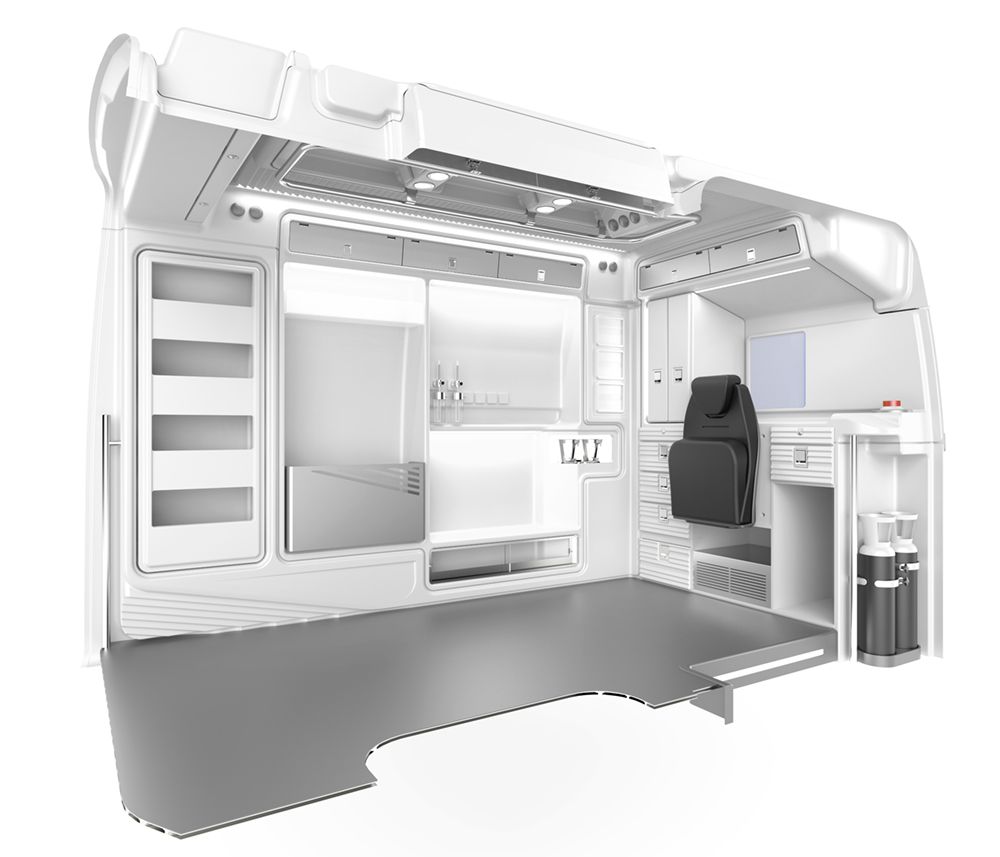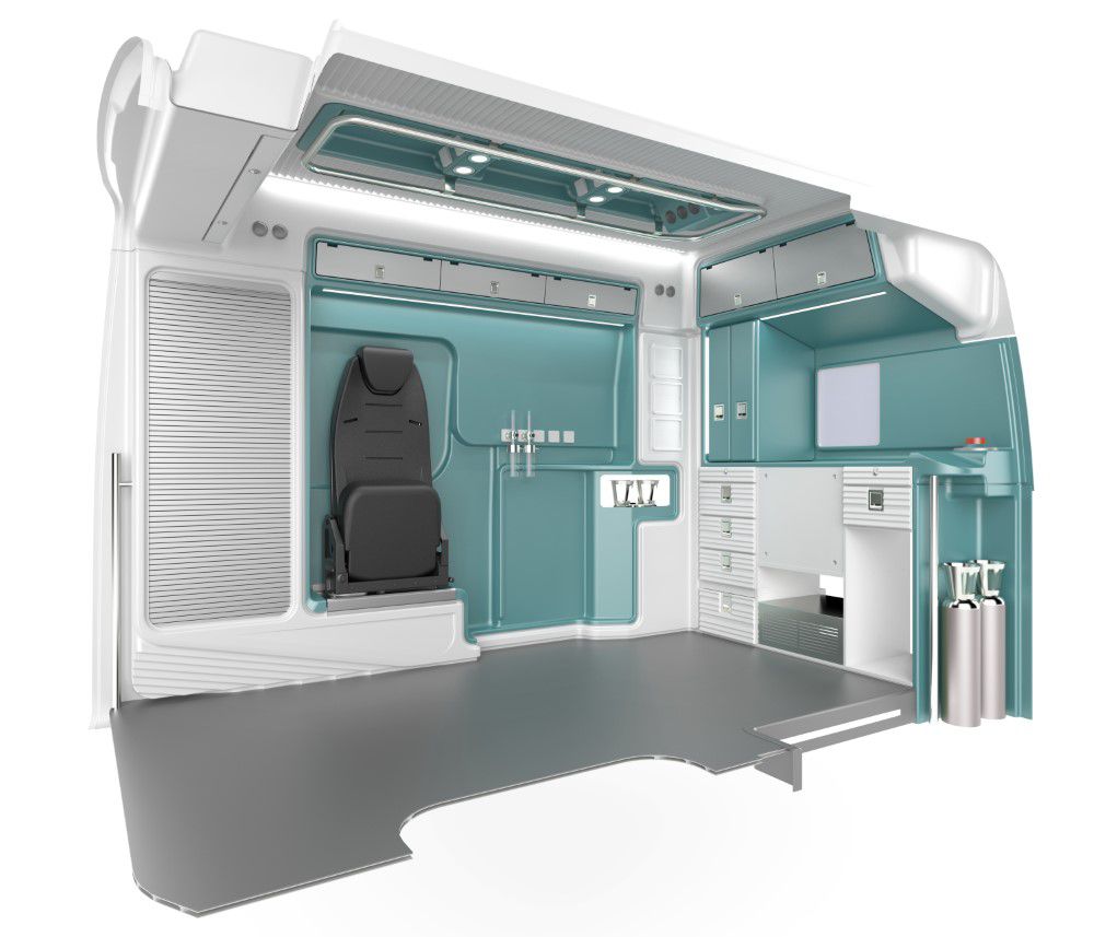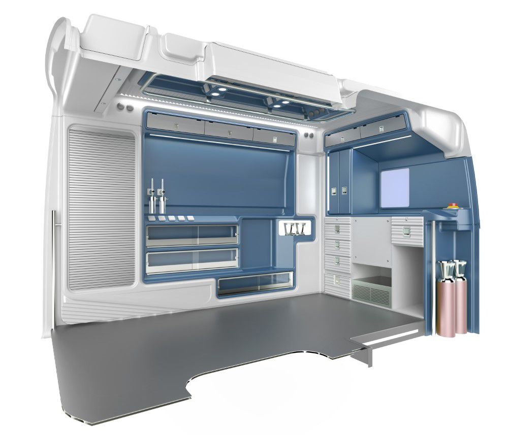 Cal destacar que aquesta unitat està realitzada segons l'última tecnologia i segons les directrius de la normativa europea. La cabina assistencial està realitzada amb làmines d'ABS, un material altament resistent a l'impacte, amb una magnífica resistència tèrmica i química, així com excel·lents propietats de termoformat. Gràcies a aquest material, s'obtenen superfícies llises en què s'eliminen cantonades, es minimitzen els angles i es redueix molt el pes de la transformació.