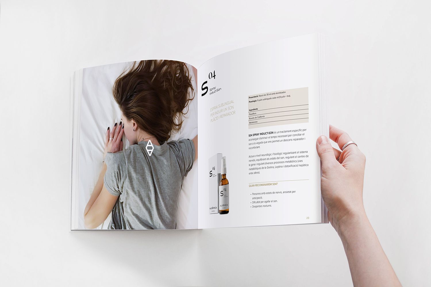Diseño y maquetación del catálogo de productos Algēmica. Es un catálogo dedicado exclusivamente a los profesionales que comercializan la marca Algēmica. Una importante herramienta para explicar al consumidor, las características de los productos Algēmica y también es un manual de consulta y formación para los profesionales, ya que incluye características técnicas sobre los ingredientes y la composición de los productos. Por este motivo es un catálogo comercial y, a la vez, un manual de consulta y herramienta de formación para el personal.