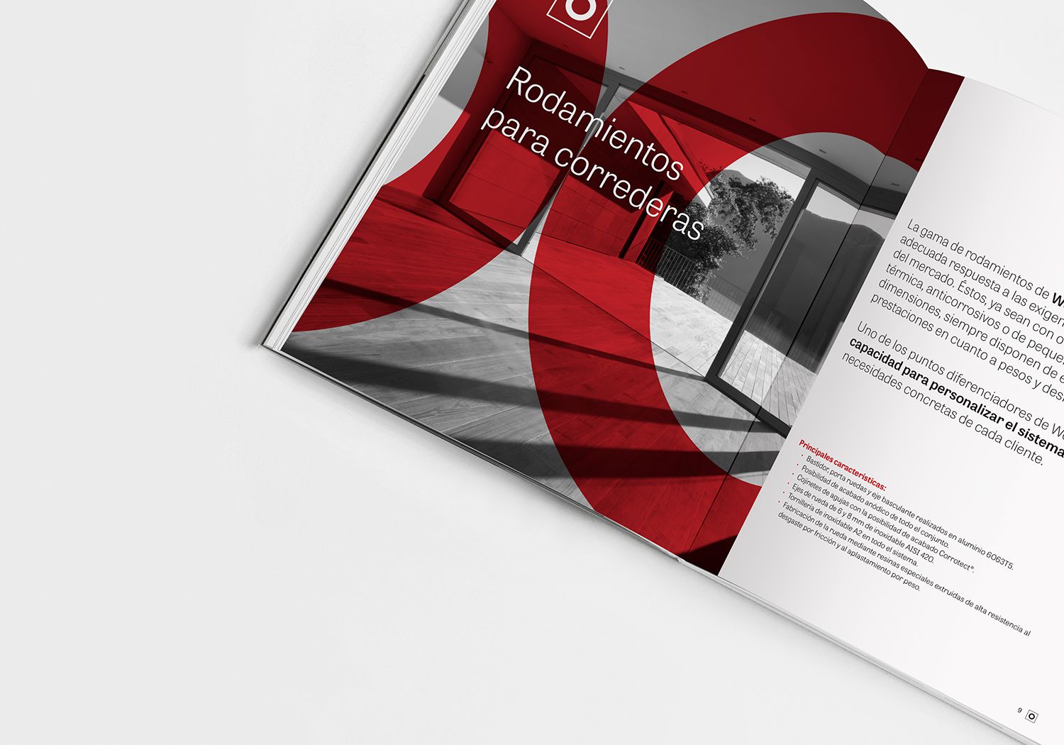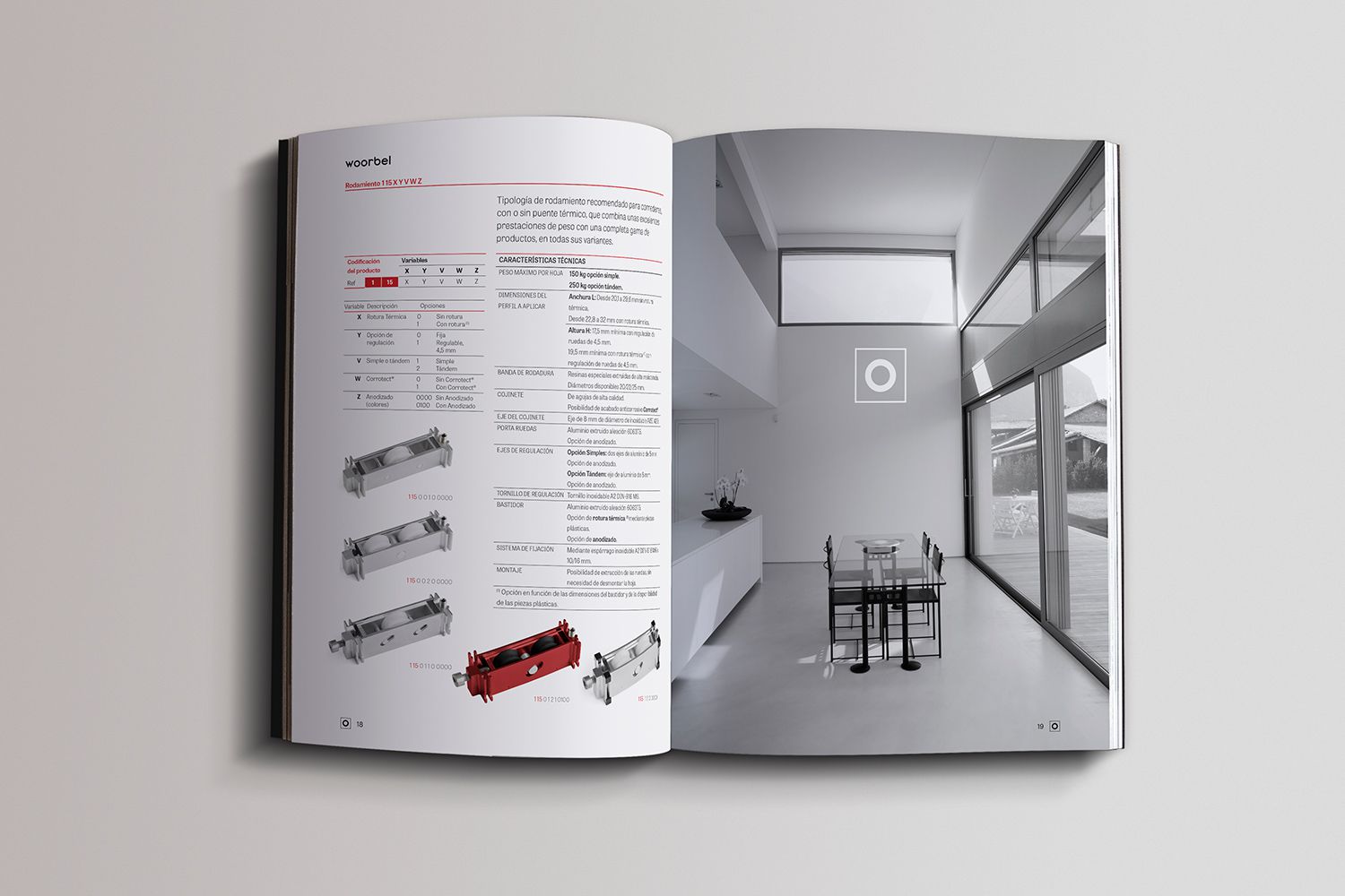 El catálogo Woorbel es un catálogo de 48 páginas en formato A4. Sigue la estética de la imagen corporativa de la marca que juega a dos colores, el rojo corporativo y el blanco y negro, con lo que se ha conseguido un catálogo a dos tintas de una gran calidad. Además, Magma ha realizado las fotografías del producto, tanto las imágenes técnicas como las imágenes artísticas de los rodamientos.